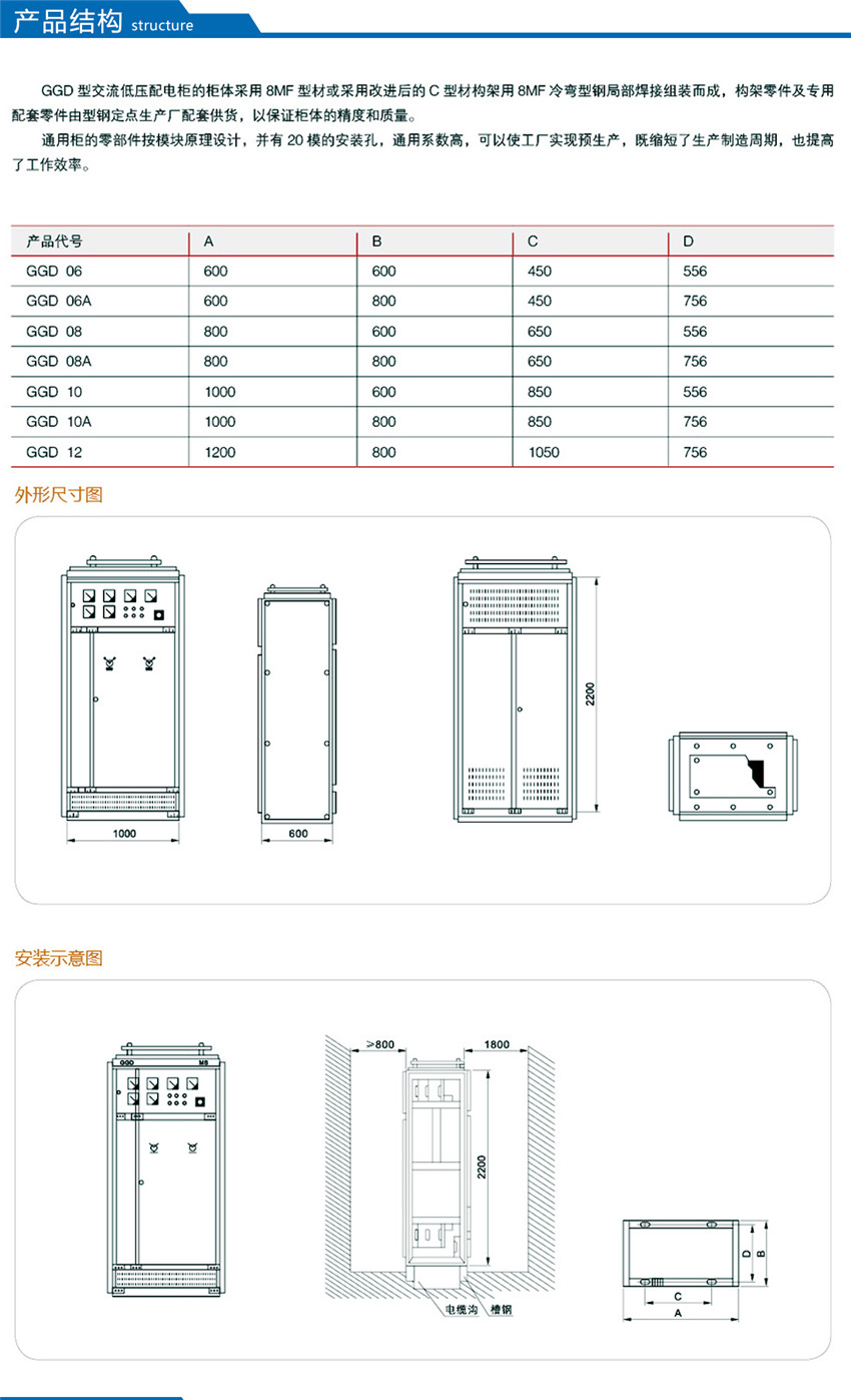GGD型交流低壓配電柜是根據能源部主管上級,廣大電力用戶及設計部門的要求,本著安全、經濟、合理、可靠的原則設計的新型配電柜。產品具有分斷能力高,動熱穩(wěn)定性好,電氣方案靈活、組合方便,系列性、實用性強,結構新穎、防護等級高等特點,可以作低壓成套開關設備的更新?lián)Q代產品使用。并且廣泛適用于發(fā)電廠、變電所、工業(yè)企業(yè)等電力用戶作為交流50HZ,額定工作電壓380V,額定電流至3150A 的配電系統(tǒng)中作為動力,照明及配電設備的電能轉換、分配與控制之用。該產品分斷能力高,額定短結構新穎等特點。該產品是我組裝式、固定面板開關柜的代表產品之一。