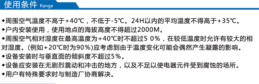 裝置適用于發(fā)電廠、石油、化工、冶金、紡織、高層建筑等低壓配電系統(tǒng)。海拔高度不超過1000m;周圍環(huán)境溫度-25℃ - +40℃;無導電性塵埃、腐蝕性氣體和水蒸氣的場所;無火災和爆炸危險的場所;無經常性劇烈震動場所。